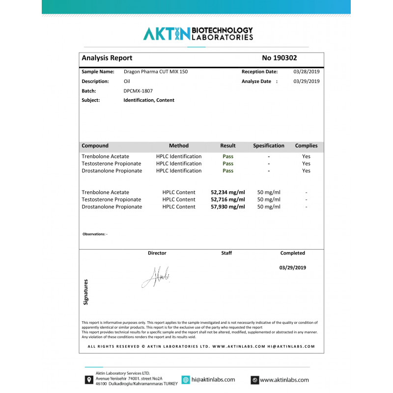 Manufacturer: Dragon Pharma Substance: Drostanolone Propionate, Testosterone Propionate, Trenbolone Acetate Package: 10ml vial (150mg/ml)