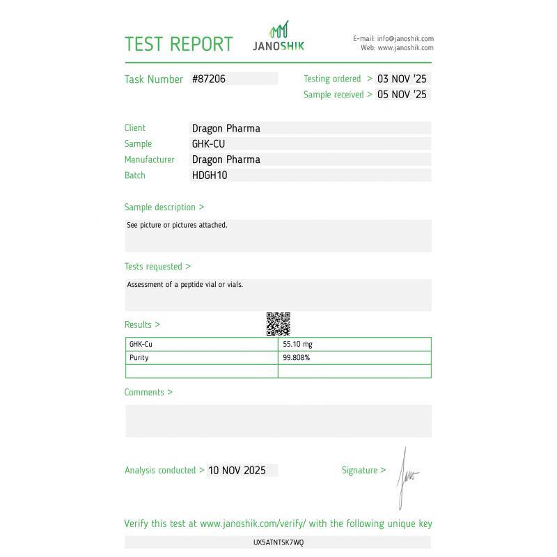 NEW! Manufacturer: Dragon Pharma Substance: GHK-Cu 50mg Package: 1 vial (50 mg)