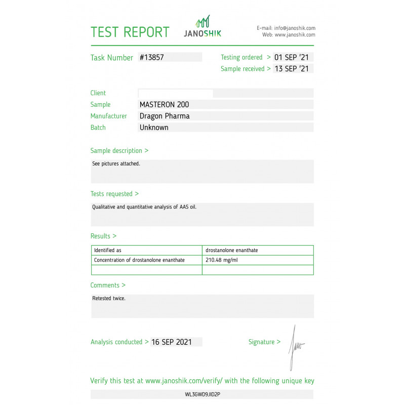 Manufacturer: Dragon Pharma Substance: Drostanolone Enanthate Package: 10 mL vial (200 mg/mL)