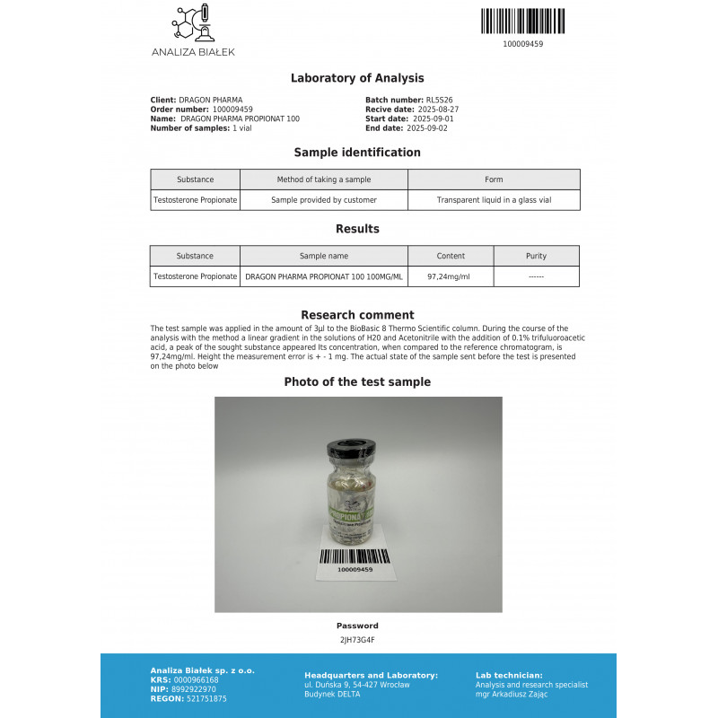 Manufacturer: Dragon Pharma Substance: Testosterone Propionate Package: 10 mL vial (100 mg/mL)