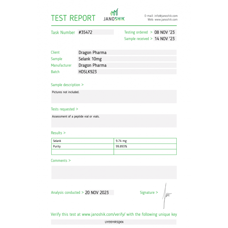 Manufacturer: Dragon Pharma Substance: Selank Package: 1 vial (10 mg) (powder form)